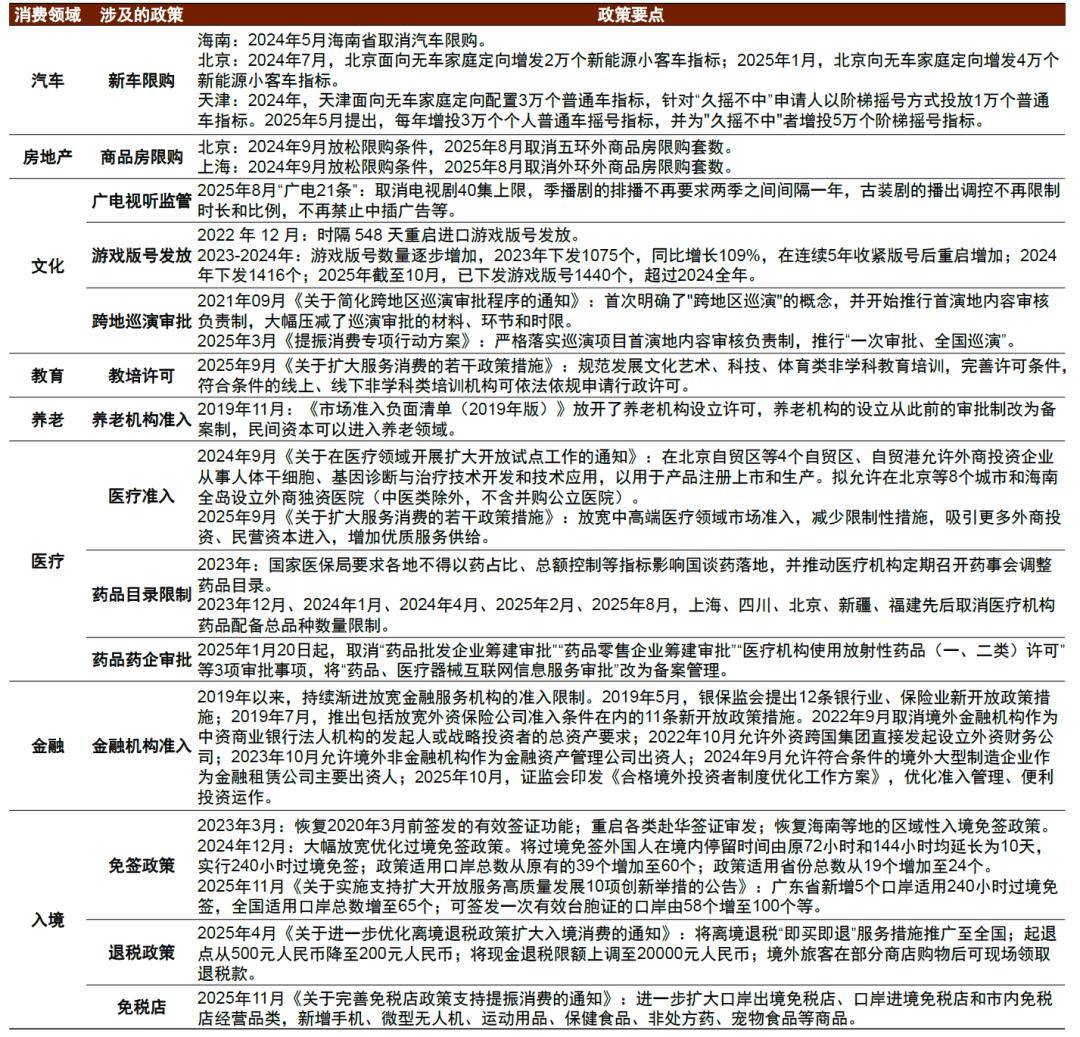 优化监管主要是“建立健全适应消费新业态新模式新场景的管理办法”。例如2025年8月“广电21条”打破广电视听行业原有的一些限制、2023年以来增加游戏版号数量等举措。除了广电视听游戏等文化产品审批,其他消费领域也有监管优化的空间,例如发展低空经济、私人飞机,需要在空域使用方面做政策调整;发展游艇、游轮消费,涉及到海事运营等方面的监管;鼓励大型文娱体育活动,涉及到活动举办审批、售票数量限制、演出内容审核等。通过监管审批政策的优化调整,有利于释放被监管政策抑制的消费供给。